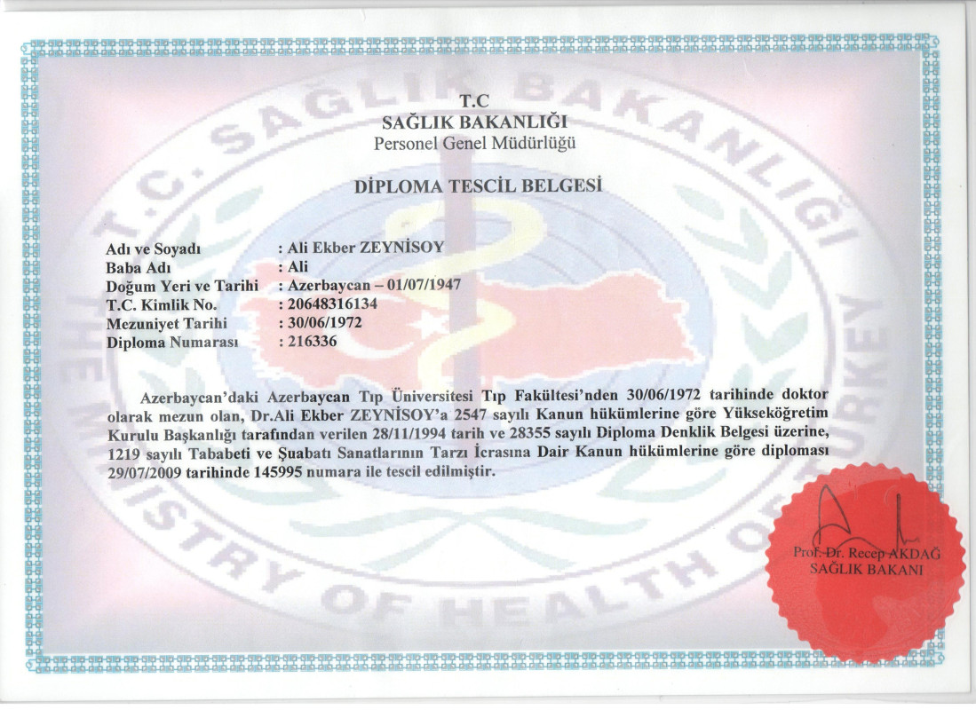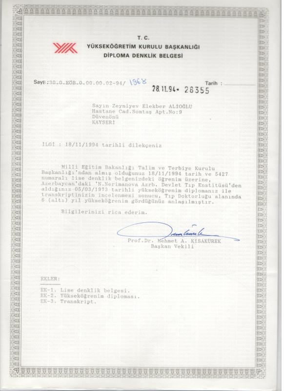1994-də TC YÖK tərəfindən həkimlik diplomumun dənkliyi təsdiq